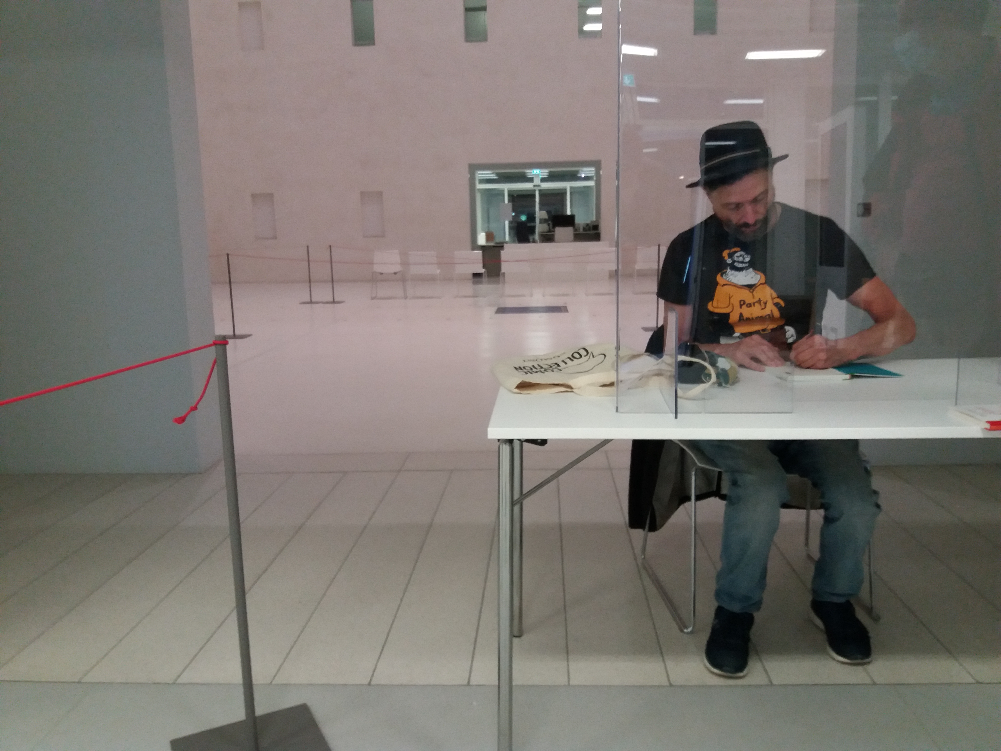 Gewöhnungsbedürftig sicher das stark reduzierte Publikum, obwohl der Saal in Rekordzeit ausverkauft war! Normalerweise hätten nur wesentlich mehr Besucherinnen und Besucher in den Saal gepasst. Das Publikum kam aber in stundenlanger Leseshow ziemlich in Stimmung – trotz pandemiebedingt lichter Reihen in einem Saal, der bei Ralf König normalerweise in kurzer Zeit sehr voll wäre. Gewöhnungsbedürftig auch das Signieren hinter Plexiglas, mit kurzer Schlange bemundschutzter Leser, die sonst auch schon einmal bis Mitternacht dicht an dicht anstanden.